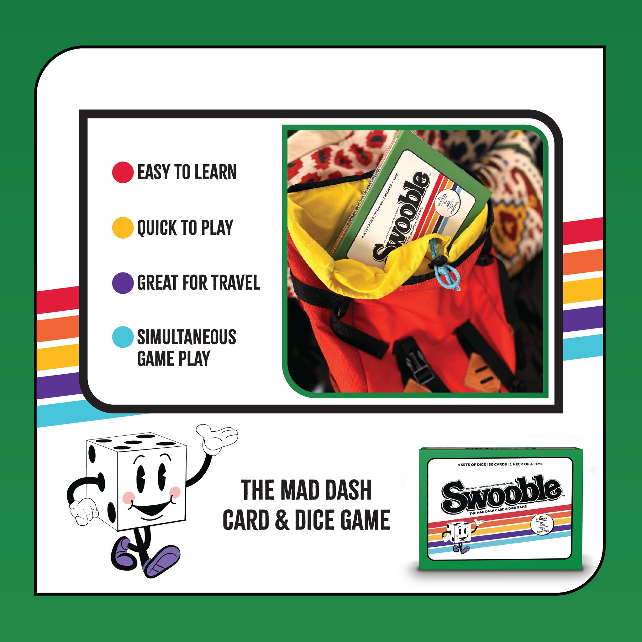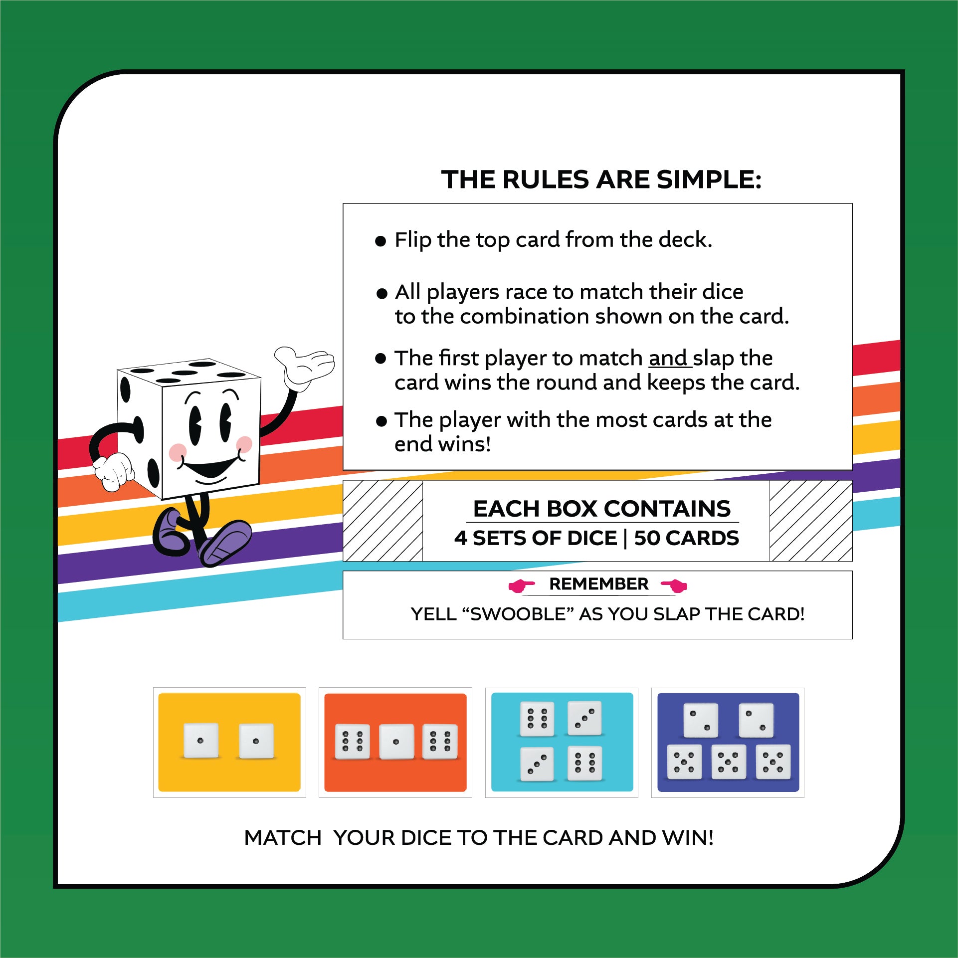 "Swooble" is a mad dash card and dice game where players race head-to-head to match their dice to the combinations shown on the cards.